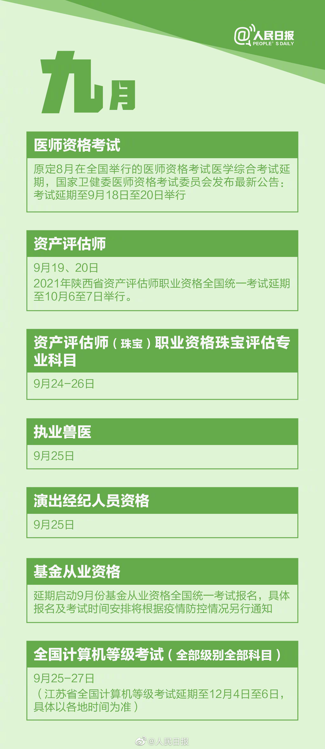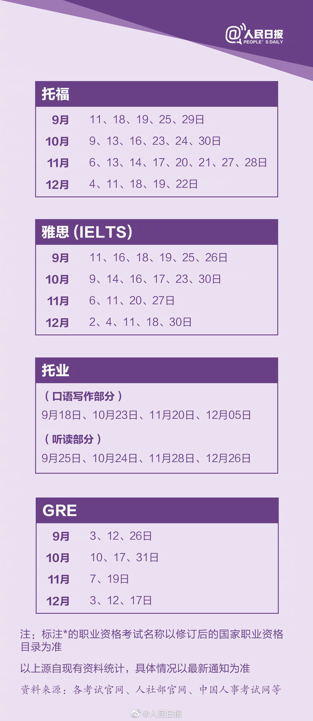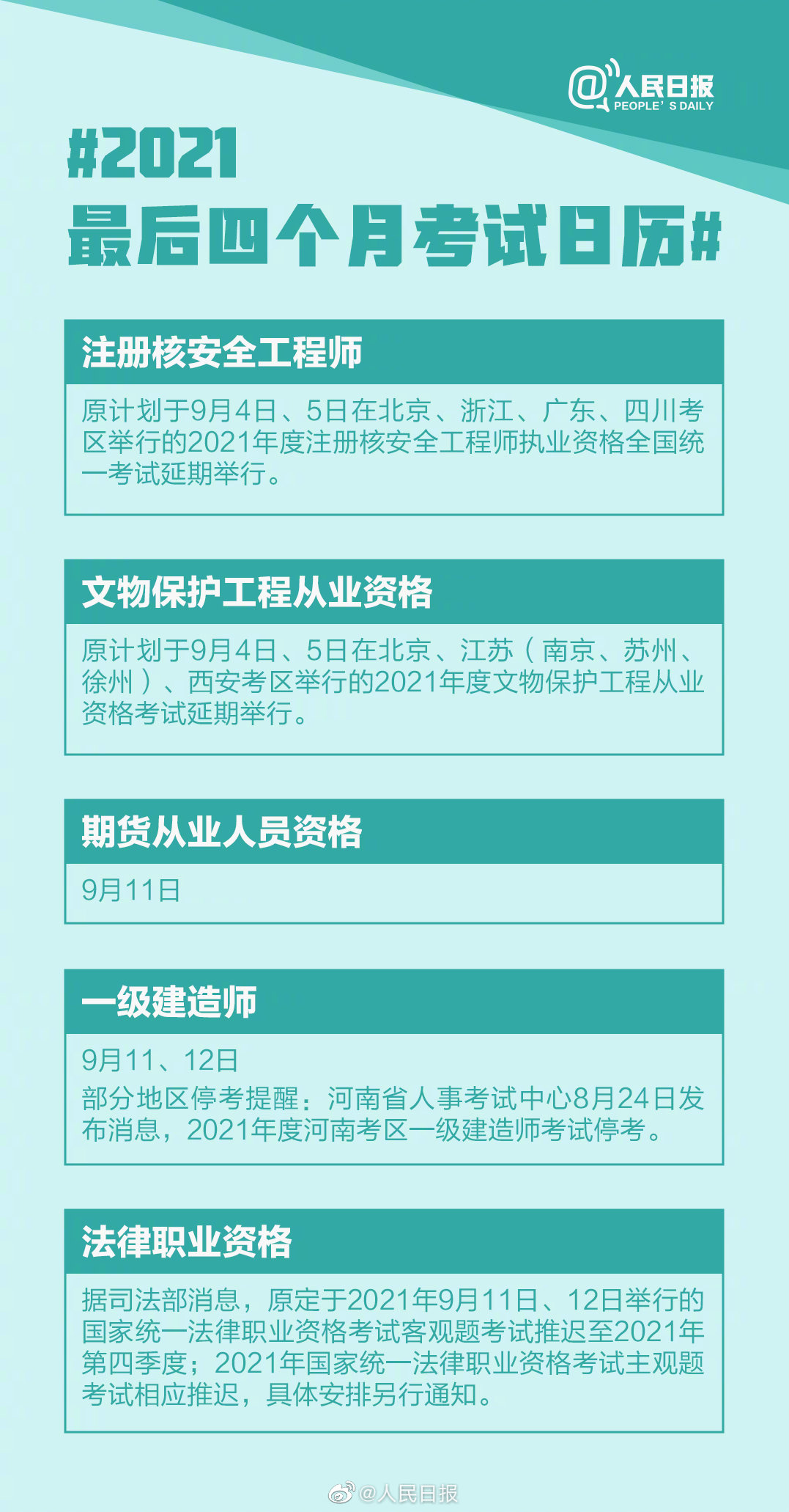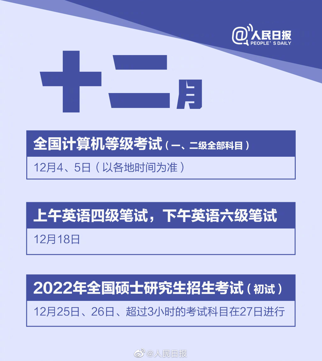 新学期已经开始,而2021年只剩下最后4个月了。9-12月还有哪些重要考试?不管是工作还是学习,你做好准备全力以赴了吗?收藏这份2021最后四个月考试日历↓↓一起加油,不留遗憾,2021,冲!