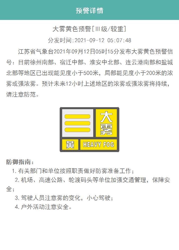 江苏省气象台2021年09月12日05时15分发布大雾黄色预警信号:目前徐州南部、宿迁中部、淮安中北部、连云港南部和盐城北部等地区已出现能见度小于500米,局部能见度小于200米的浓雾或强浓雾。预计未来12小时上述地区的浓雾或强浓雾将持续,请注意防范。