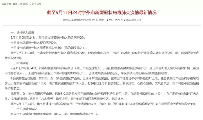 9月11日0时至24时,我市报告新增确诊病例1例(莆田市仙游县输入)。当日报告新增本地疑似病例0例。当日报告新增无症状感染者1例(莆田市仙游县输入)。上述2例感染者的工作地和感染地均为莆田市,现住地为泉州市泉港区,为枫亭镇与界山镇两者地域相邻的村。