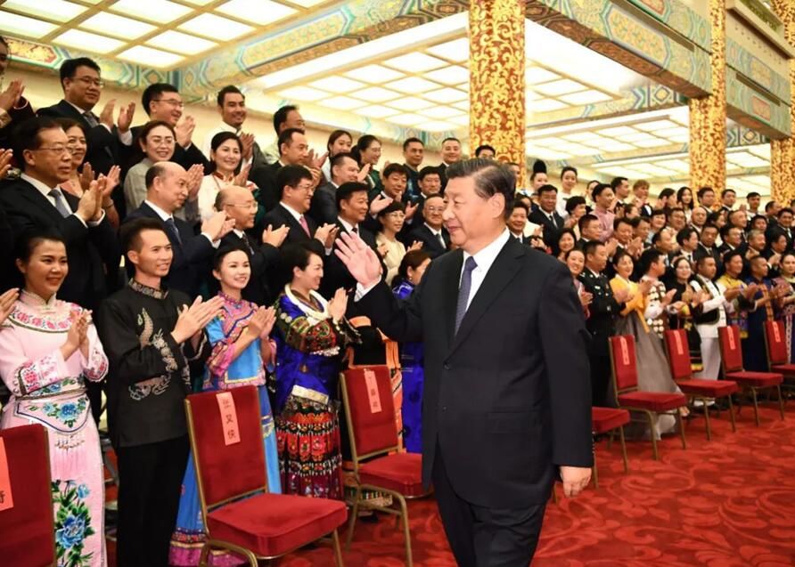 8月31日晚,第六届全国少数民族文艺会演开幕式文艺晚会在北京人民大会堂隆重举行。习近平、李克强、汪洋、王沪宁等党和国家领导人出席观看。这是演出开始前,习近平等会见文艺会演演职人员代表、组委会成员、56个民族的优秀基层党员代表等 燕雁摄/本刊