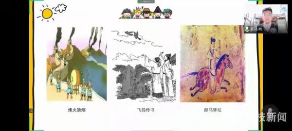 裴远鹏以提问互动形式开启课堂,通过图片与视频结合的形式为孩子们介绍了从古至今通讯方式的转变与发展,从击鼓传信到烽火狼烟,从驿马传书到电话电报,孩子们听的津津有味。