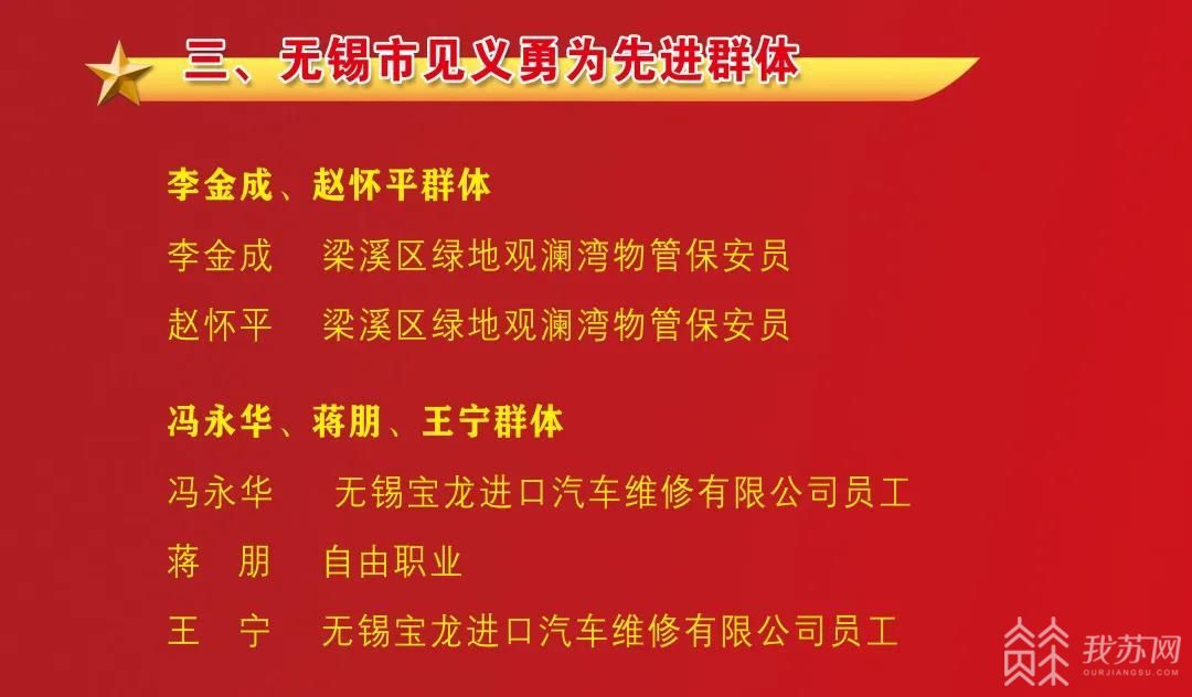 李金成、赵怀平等2个群体获“无锡市见义勇为先进群体”称号。