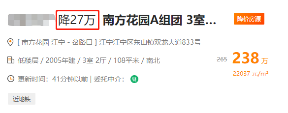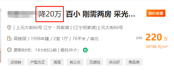 在该平台的二手房板块中,点击“24小时降价”房源的选项,可以查看相关片区的房价报价变动情况。在该平台纳入统计的近5300套江宁二手房中,整体均价为25794元/㎡,其中在过去24小时内降价的房源为126套,而涨价房源只有15套。记者查看发现,降幅较大的一套是来自百家湖附近的中小户型,面积76平方米,原先挂牌价为240万,目前已经下调至220万,单价也降为28788元/㎡;岔路口南方花园一套108平方米房源的降幅更大,达到27万,原先报价为265万,现在挂牌价238万,单价回落至22037元/㎡。记者注意到,多数房源的降幅在10万以内,以3万-5万为主,中介人士介绍说,以目前的市场行情来看,几万元的优惠几乎难以吸引到买家,房主不下“血本”估计很难成交。