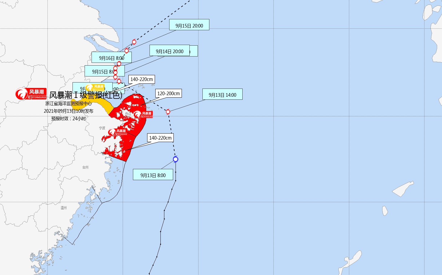 浙江省海洋监测预报中心9月13日10时发布风暴潮Ⅰ级警报:受第14号台风“灿都”(强台风级)影响,预计今天中午到明天中午:嘉兴、宁波沿岸将出现140~220厘米的风暴增水,舟山沿岸将出现120~200厘米的风暴增水。金塘、镇海站将出现超过当地红色警戒潮位的高潮位;定海、北仑站将出现超过当地橙色警戒潮位的高潮位;澉浦、乍浦、岱山、小衢山、长白、舟山、六横站将出现超过当地黄色警戒潮位的高潮位;湖头渡、乌沙山站将出现超过当地蓝色警戒潮位的高潮位。风暴潮预警级别为红色。