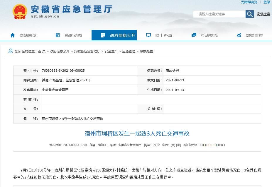 荔枝新闻讯 据安徽省应急管理厅网站9月13日消息,9月9日18时50分许,宿州市埇桥区北杨寨境内206国道大张村路段一出租车与相对方向一公交车发生碰撞,造成出租车驾驶员当场死亡、3名受伤乘客中的2人经抢救无效死亡,此次事故共造成3人死亡。事故原因调查和善后处置工作正在进行中。