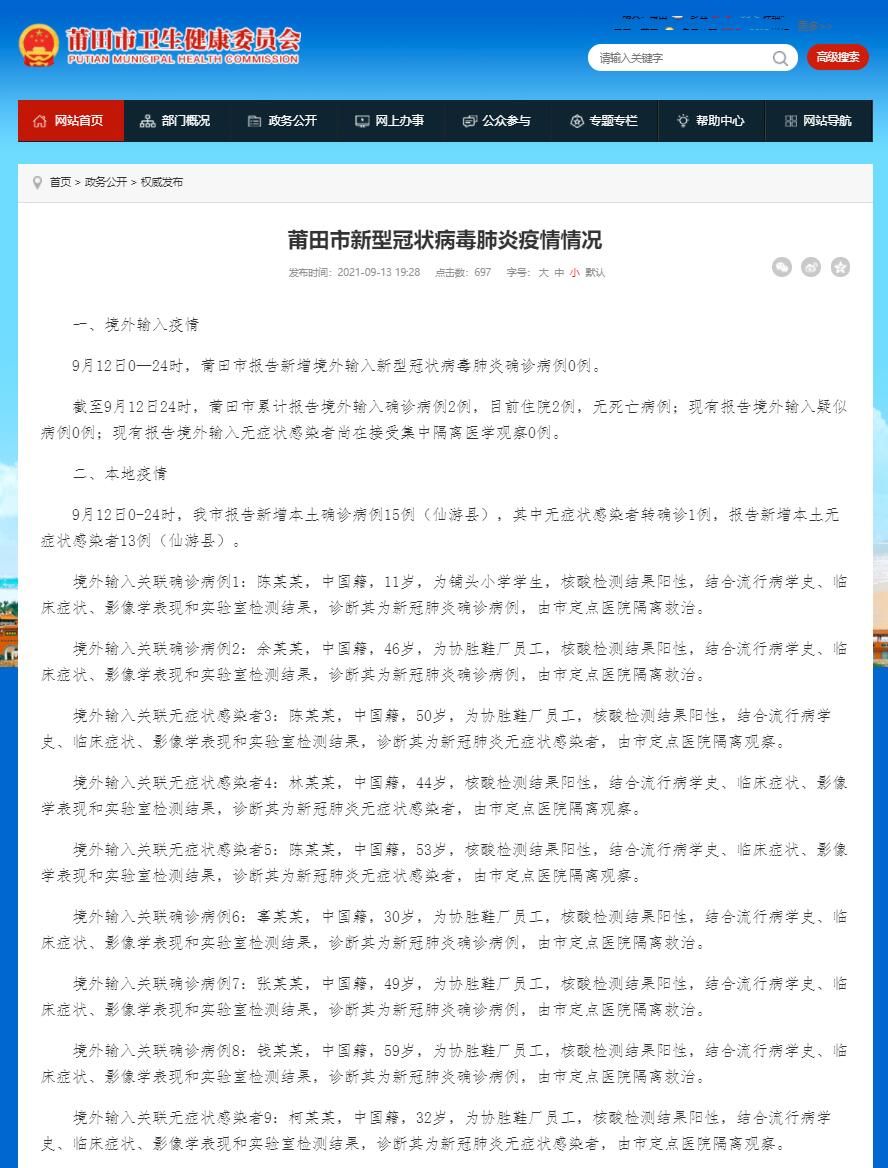 9月12日0-24时,莆田市报告新增本土确诊病例15例(仙游县),其中无症状感染者转确诊1例,报告新增本土无症状感染者13例(仙游县)。