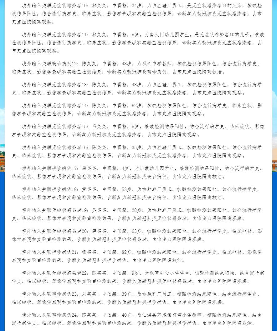 境外输入关联确诊病例25:薛某某,中国籍,6岁,为枫亭中心小学学生,核酸检测结果阳性,结合流行病学史、临床症状、影像学表现和实验室检测结果,诊断其为新冠肺炎确诊病例,由市定点医院隔离救治。