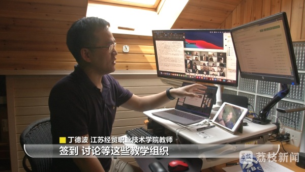 在宁高校学子尚未返校,不少教师开始线上教学。日前,记者来到江苏经贸职业技术学院丁德波老师的家中,坐在丁老师旁边观摩了一节网课。