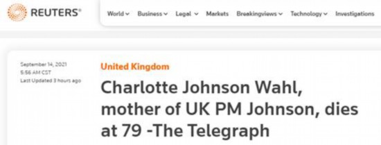 路透社报道截图:英国首相约翰逊的母亲夏洛特·约翰逊·沃尔去世,终年79岁-《每日电讯报》