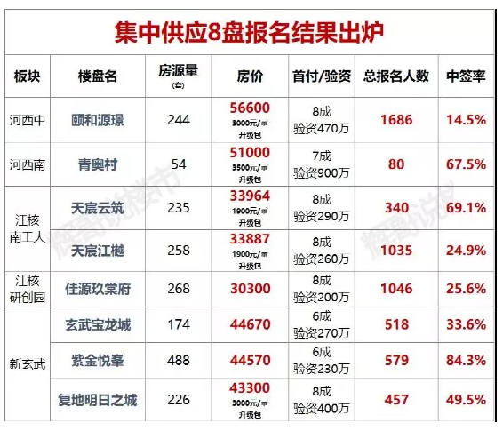 对于诸多买房人来说,不久前公布的南京第二批次集中供应楼盘堪称“热盘总动员”,8家分布在江北核心区、河西、城北等热门板块的楼盘共计推出1947套房源。从“宁小通”上已经公布的报名数据上看,江北核心区的天宸云筑最为出人意料,235套房源只有340组买房人报名,整体中签率为69.1%,近7成的中签率跟过去江北核心区不到20%的中签率相比,有大幅提高;而处于同一区位的另一家楼盘天宸江樾,推出的258套房源却有1035组买房人报名,中签率约为25%。记者注意到,这两家楼盘的单价均为33000元/㎡左右,均配置了1900元/㎡的装修包,有所区别的是天宸江樾临近浦口大道,而天宸云筑临近七里河,且后者的户型面积更大一些,起步户型为112平方米,门槛更高,导致报名人数偏少。