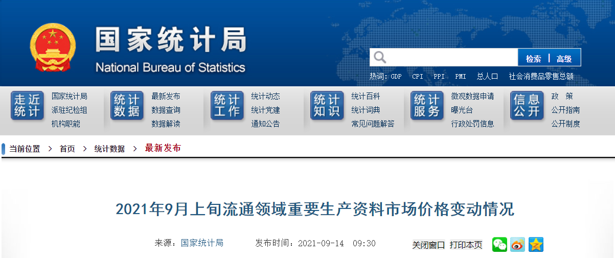 据国家统计局网站消息,国家统计局14日发布2021年9月上旬流通领域重要生产资料市场价格变动情况。据对全国流通领域9大类50种重要生产资料市场价格的监测显示,2021年9月上旬与8月下旬相比,34种产品价格上涨,11种下降,5种持平。