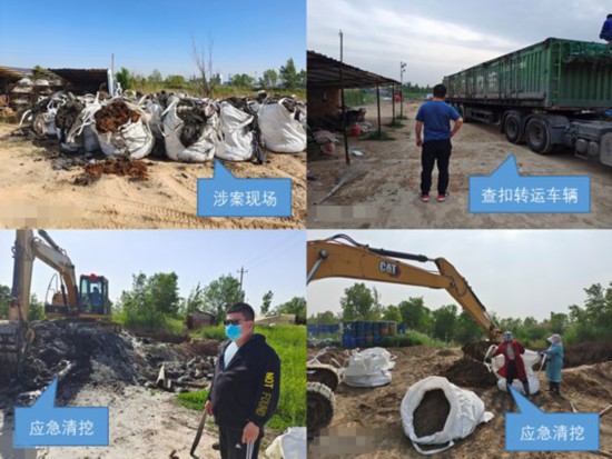 2021年1月,一名其他案件的犯罪嫌疑人向公安机关举报“德州市临邑县王某在其水产养殖院内填埋不明废物”。根据线索,山东省德州市临邑县公安局、德州市生态环境局临邑分局及涉案街道办事处立即进行调查,并在第一时间与危废转出地(江苏、甘肃)取得联系,三地各部门相互协同办案,顺利摸清整条非法利益链,将产废单位和非法倾倒危废的犯罪嫌疑人一举抓获。