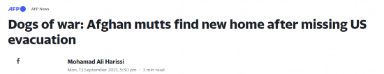 法新社称,美国于8月30日将其最后一支部队撤出阿富汗,在最后一名士兵离开几个小时后,动物保护组织PETA在一份声明中称,美军留下了60只炸弹嗅探犬和其他60只"工作犬"。不过,五角大楼很快否认了该消息。五角大楼发言人约翰柯比称,美军没有将任何军犬遗留在喀布尔机场。