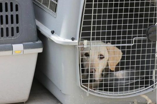狗在喀布尔机场临时训练中心的宠物笼子里休息
