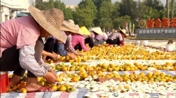新宝堂员工在翻晒陈皮(资料照片)。新华社记者王丰通联