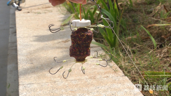 在附近的一处河堤,记者发现了地上摆放着十几根抛竿,像龙门阵一样。和其他鱼竿相比,抛竿的鱼钩能摔到三十多米外的河中央。趁市民收竿的时候,记者观察了一下,抛竿使用的是圆盘状的爆炸钩,有单层的,还有双层的。记者数了一下,一组有16个鱼钩。钓鱼市民表示:他不会其他钓鱼方法,这种抛竿加上爆炸钩,钓起来非常方便。
