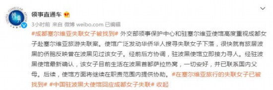 外交部领事保护中心和驻塞尔维亚使馆高度重视成都女子赴塞尔维亚旅游失联案。使馆广泛发动华侨华人搜寻失联女子下落,很快就有旅居波黑的侨胞反映曾在波黑见过该女子。经前后方协调,驻波黑使馆立即接力寻人。经驻波黑使馆最新确认,该女子目前生活在波黑首都萨拉热窝,一切安好,并已联系国内父母。后续,使馆方面将继续在职责范围内提供协助。