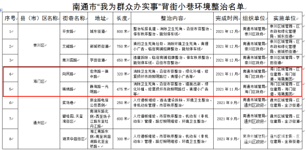 此次海门区涉及的两条背街小巷分别是向民路(宏伟路—镇中路),长度320米,整治内容为消除卫生死角、沿街市容整治、绿化补植、修复损坏市政照明路灯、清理小广告等;锦绣路(静海路—光明路),长度475米,整治内容为消除卫生死角、沿街市容整治、墙面出新、绿化补植、修复损坏市政照明路灯、清理小广告等。这两条路整治的实施单位为区城管局、区住建局、海门街道、海晟集团。