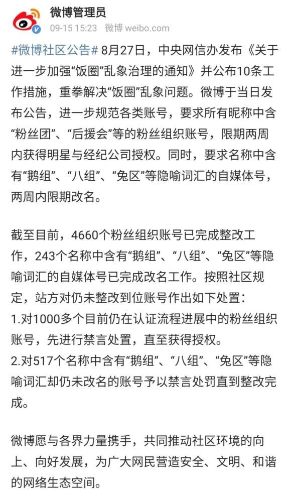 8月27日,中央网信办发布《关于进一步加强“饭圈”乱象治理的通知》并公布10条工作措施,重拳解决“饭圈”乱象问题。微博于当日发布公告,进一步规范各类账号,要求所有昵称中含“粉丝团”、“后援会”等的粉丝组织账号,限期两周内获得明星与经纪公司授权。同时,要求名称中含有“鹅组”、“八组”、“兔区”等隐喻词汇的自媒体号,两周内限期改名。