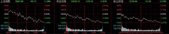 上证指数跌1.34%,报3607.09点。深证成指跌1.91%,报14258.13点。创业板指跌2.24%,报3128.84点。