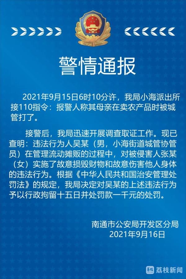 9月16日,南通市公安局开发区分局发布警情通报:9月15日拎起摆摊老人重摔在地的城管协管员吴某被行政拘留十五日,并处罚款一千元的处罚。