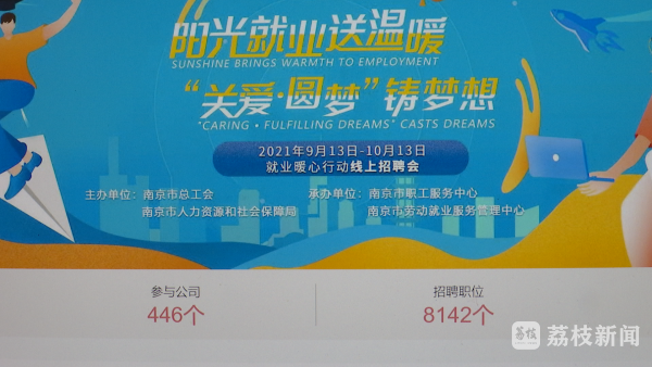 2021年"阳光就业送温暖,关爱·圆梦铸梦想"线上招聘会,由南京市总工会、人社局主办,依托智联招聘平台,从9月13日开始,持续一个月的时间。此次招聘的岗位包括了科技研发、商贸零售和社区服务等多个类别,还提供了数百个网约车司机、外卖骑手等新业态岗位,可以最大限度帮助就业困难群体获得就业岗位。目前,招聘岗位已经超过8000个,还在持续增加中。