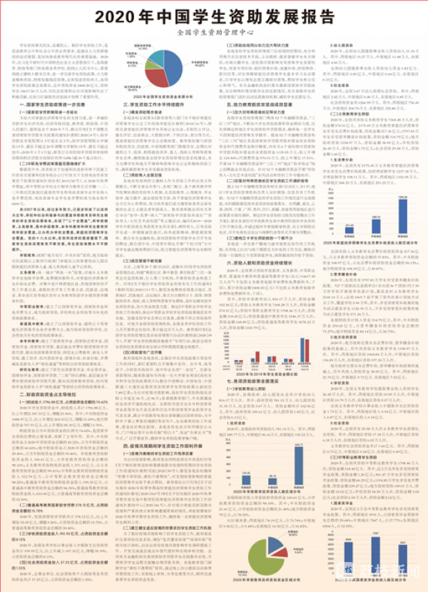 9月16日,全国学生资助管理中心发布《2020年中国学生资助发展报告》。报告显示,全年共投入资助资金2408.20亿元,资助学生14617.50万人次,资助人数、资助资金持继增长,精准资助稳步推进,为抗击疫情和应对汛情影响作出了积极贡献,在助力打赢脱贫攻坚战中发挥了重要作用。