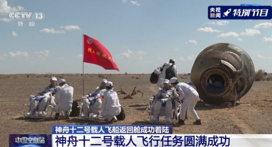 神舟十二号载人飞船返回舱在东风着陆场成功着陆后,执行飞行任务的航天员聂海胜、刘伯明、汤洪波安全顺利出舱,身体状态良好,空间站阶段首次载人飞行任务取得圆满成功。这也是东风着陆场首次执行载人飞船搜索回收任务。