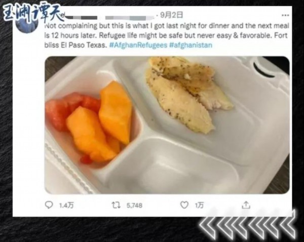 美联社的报道称,这些人可以领取丰盛的食物及饮料。但一名叫作艾哈迈迪的阿富汗人在社交媒体上发布了一张照片,餐盘中,只有少得可怜的鸡肉和水果,而下一顿饭,要等到12个小时后。