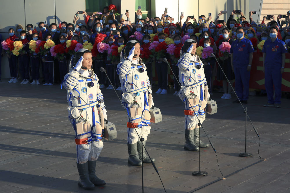 6月17日,神舟十二号航天员出征仪式在酒泉卫星发射中心举行。这是航天员聂海胜(中)、刘伯明(右)和汤洪波准备出征。