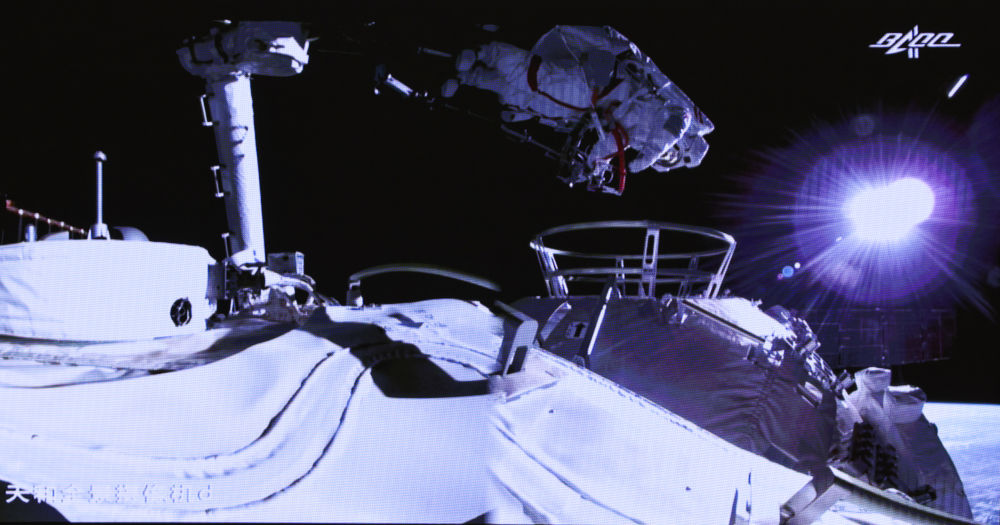 7月4日,在北京航天飞行控制中心大屏拍摄的两名航天员在舱外工作场面。