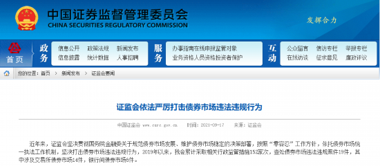 据证监会网站消息,近年来,证监会坚决贯彻国务院金融委关于规范债券市场发展、维护债券市场稳定的决策部署,按照“零容忍”工作方针,依托债券市场统一执法工作机制,坚决打击债券市场违法违规行为,2019年以来,我会累计采取相关行政监管措施152家次,查处债券市场违法违规案件19件,其中涉及交易所债券市场14件,银行间债券市场6件。