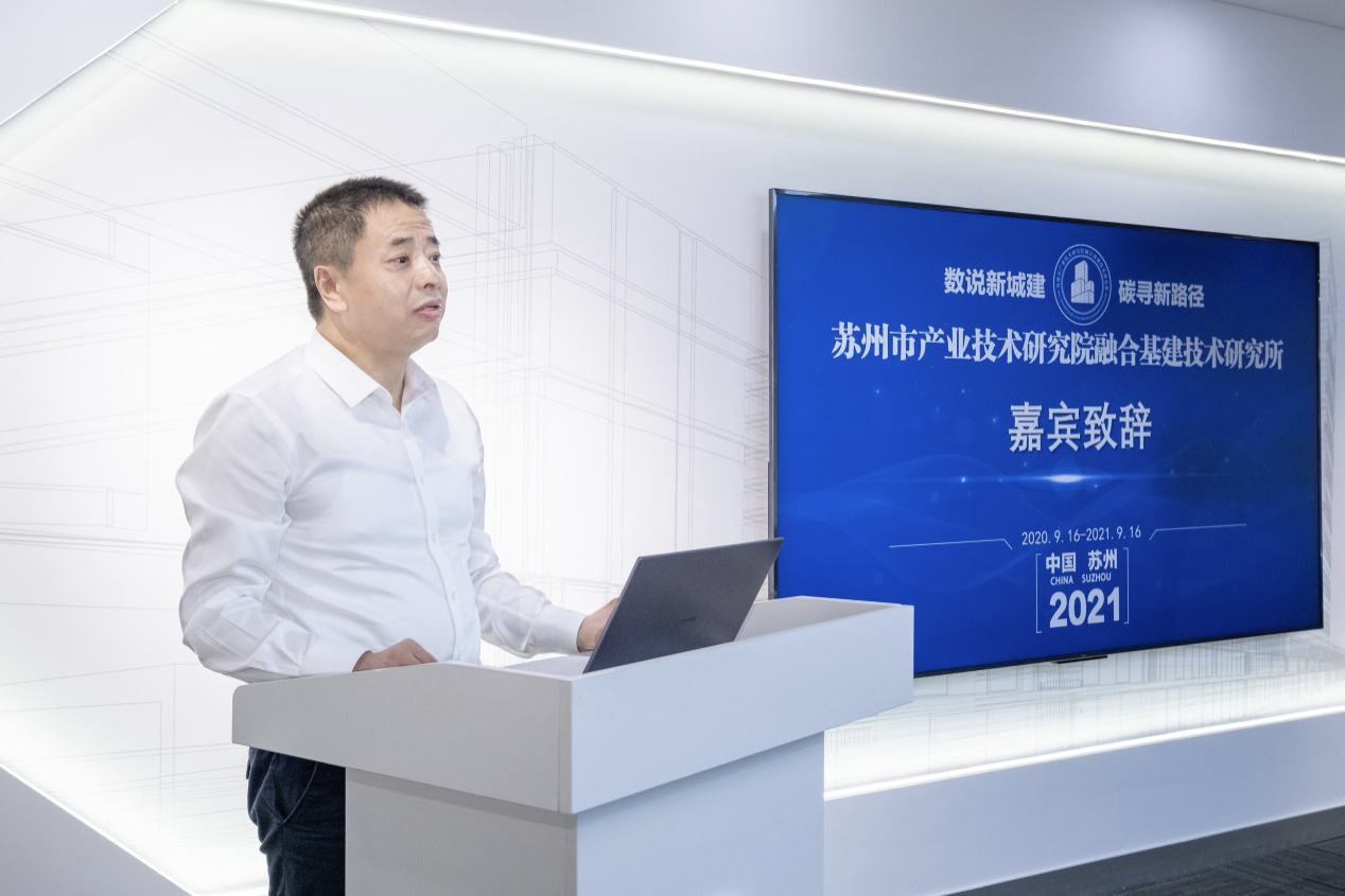 苏州市产业技术研究院融合基建技术研究所所长李国建作“数说新城建,碳寻新产业”主题演讲,向到场嘉宾汇报研究所建所一年以来的工作进展。研究所始终以人才团队为重点,以龙头企业为牵引,不忘“科技赋能”初心,深挖建造行业数字化需求,注重应用场景落地,打通科技创新和市场转化衔接通道。在推动行业数字化转型的同时,关注城市发展需求,在城市现代化发展道路上贡献研究所力量。