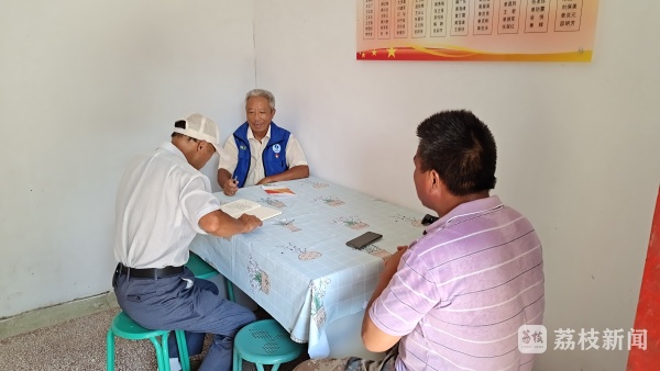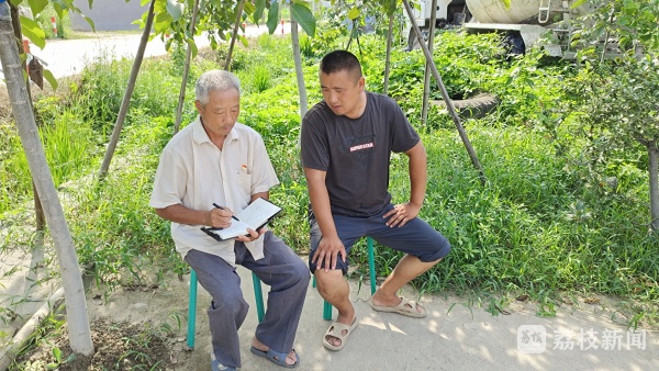 大许镇朱庙村党员中心户李传德在家门口征集意见(左一)