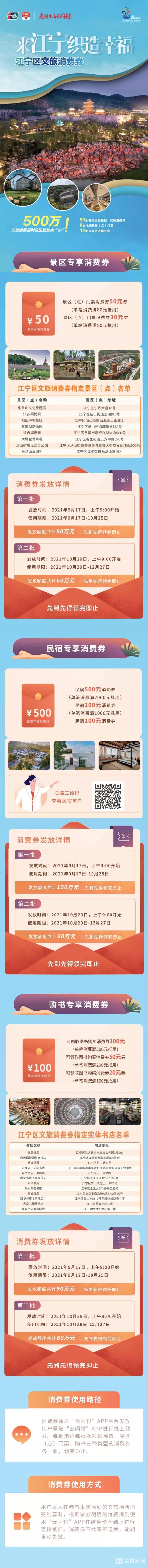 除了南京市发放的消费券外,文旅消费券也来了。9月17日、10月29日,南京江宁区分两批发放500万文旅消费券,93家指定民宿、8家收费景区(点)、12家实体书店均可使用。