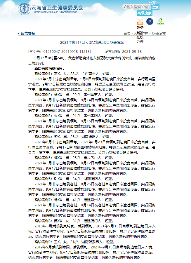 荔枝新闻讯 据云南省卫健委网站消息,9月17日0时至24时,云南省新增境外输入新冠肺炎确诊病例9例。确诊病例治愈出院23例。