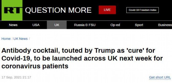 据“今日俄罗斯”(RT)、英国天空新闻17日报道,英国政府宣布,将从下周起向英国各地住院患者推出一种新的抗体治疗方法——“抗体鸡尾酒疗法”Ronapreve。RT称,这种疗法曾被用来治疗美国前总统特朗普,他曾称赞这种疗法是其最终“治愈”的关键。