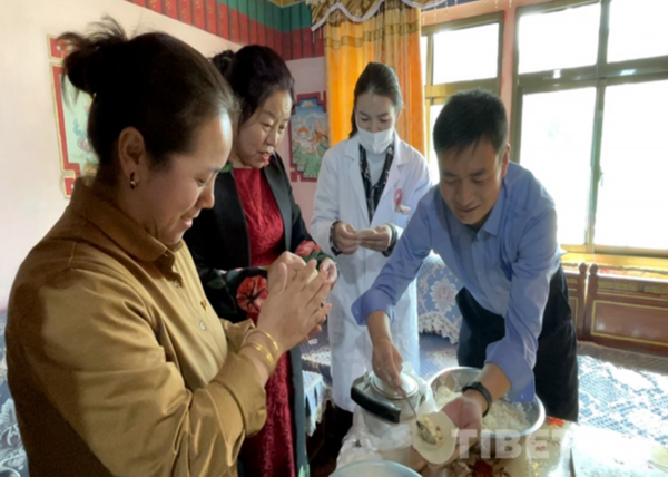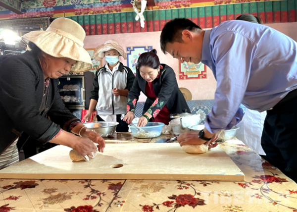 在群众的热情邀请下,慰问人员与群众共同围成一圈做起了奶渣饼,不同地方、不同民族的人们分享着各自家乡的中秋习俗和月饼做法,现场欢声笑语不断。“咱们就像正在包的奶渣饼一样,各种食材代表着各个民族,只有做到你中有我、我中有你,才能调和出最甜美的味道,才能成为真正的民族团结月饼,咱们西藏各族人民群众才能幸福平安的生活。”民警高扬一边包奶渣饼,一边向大家说。