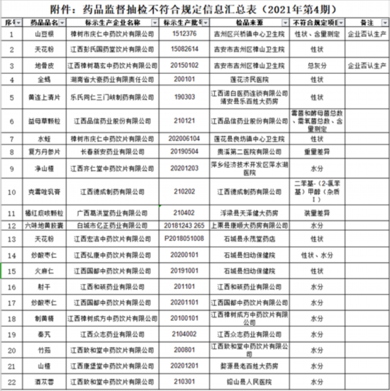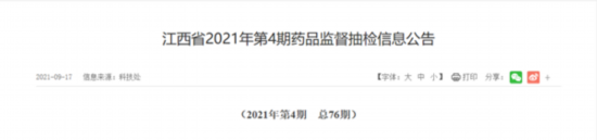 中国网财经9月18日讯 昨日,江西省药监局发布“江西省2021年第4期药品监督抽检信息公告。”
