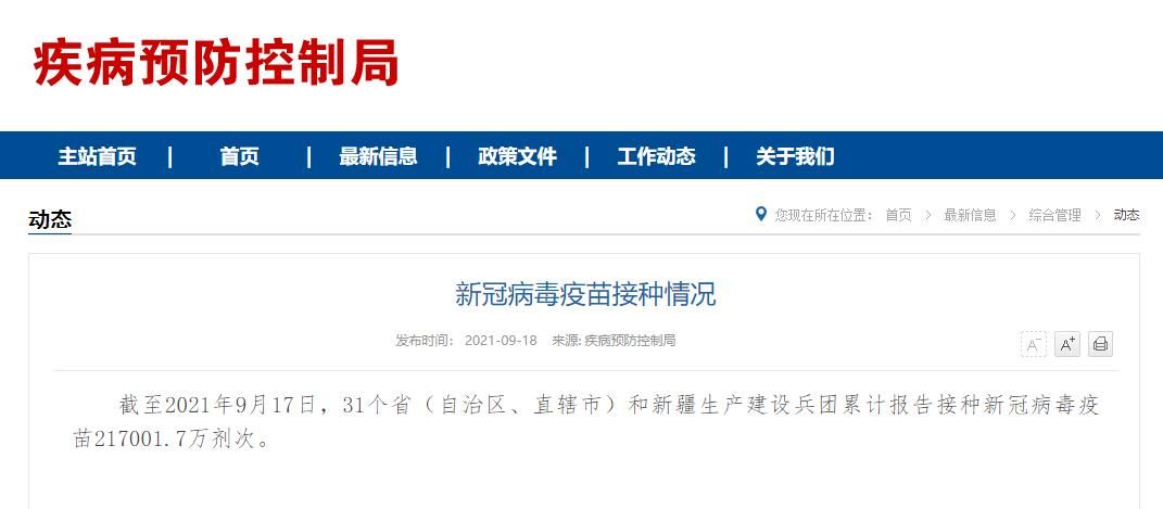 据国家卫健委网站消息,截至2021年9月17日,31个省(自治区、直辖市)和新疆生产建设兵团累计报告接种新冠病毒疫苗217001.7万剂次。
