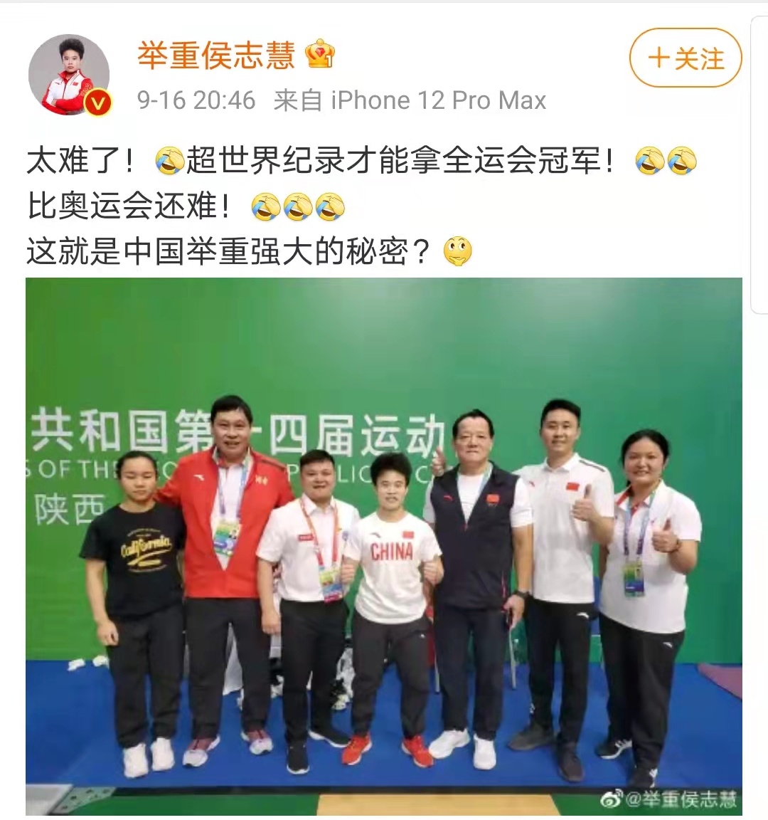 赛后,侯志慧发微博感叹:“太难了!超世界纪录才能拿全运会冠军!比奥运会还难!”