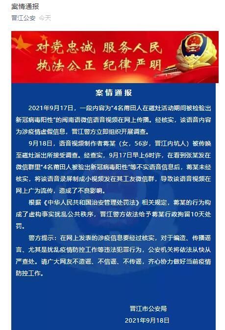 9月18日,语音视频制作者蒋某(女,56岁,晋江内坑人)被传唤至磁灶派出所接受调查。经查实,9月17日早上6时许,在看到张某发在微信群里“4名莆田人被验出新冠病毒阳性”等不实语音信息后,蒋某未经核实,将该语音录屏制成小视频发在其工友微信群,导致该语音视频在网上广为流传,造成了不良影响。