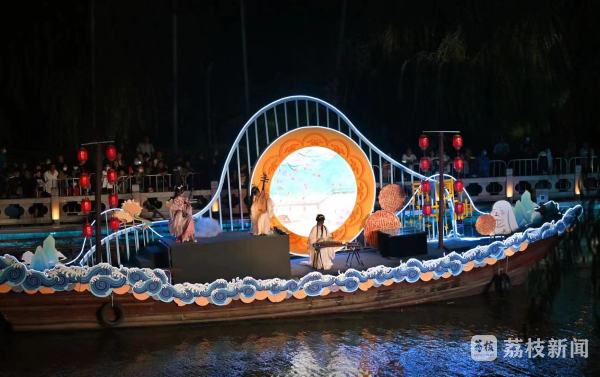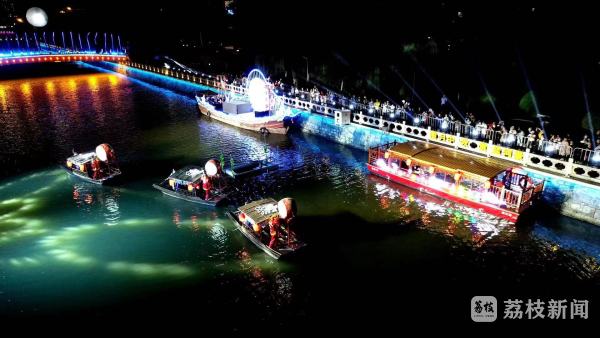 当晚,一轮皓月高悬于鹊桥上方,盐河中央“嫦娥仙子”翩翩起舞,献上水上“嫦娥奔月”沉浸式演出。舞毕,笛声悠扬,水调歌头清曲响彻盐河夜空,吸引市民驻足观赏,活动现场星光璀璨如星汉,嫦娥仙子也沉醉在盐河美景中,与就地过节的港城市民和思乡侨客一起举头望明月,低头思故乡。