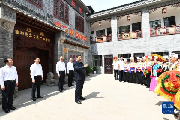 2021年9月13日至14日,习近平总书记来到陕西省榆林市绥德县非物质文化遗产陈列馆考察。陈列馆外,正在进行陕北秧歌表演。习近平总书记指出,绥德是黄土文化的重要发源地之一,非物质文化遗产资源丰富,孕育发展了优秀民间艺术,展现了陕北人民的热情、质朴、豪迈。民间艺术是中华民族的宝贵财富,保护好、传承好、利用好老祖宗留下来的这些宝贝,对延续历史文脉、建设社会主义文化强国具有重要意义。要坚持以社会主义核心价值观为引领,坚持创造性转化、创新性发展,找到传统文化和现代生活的连接点,不断满足人民日益增长的美好生活需要。