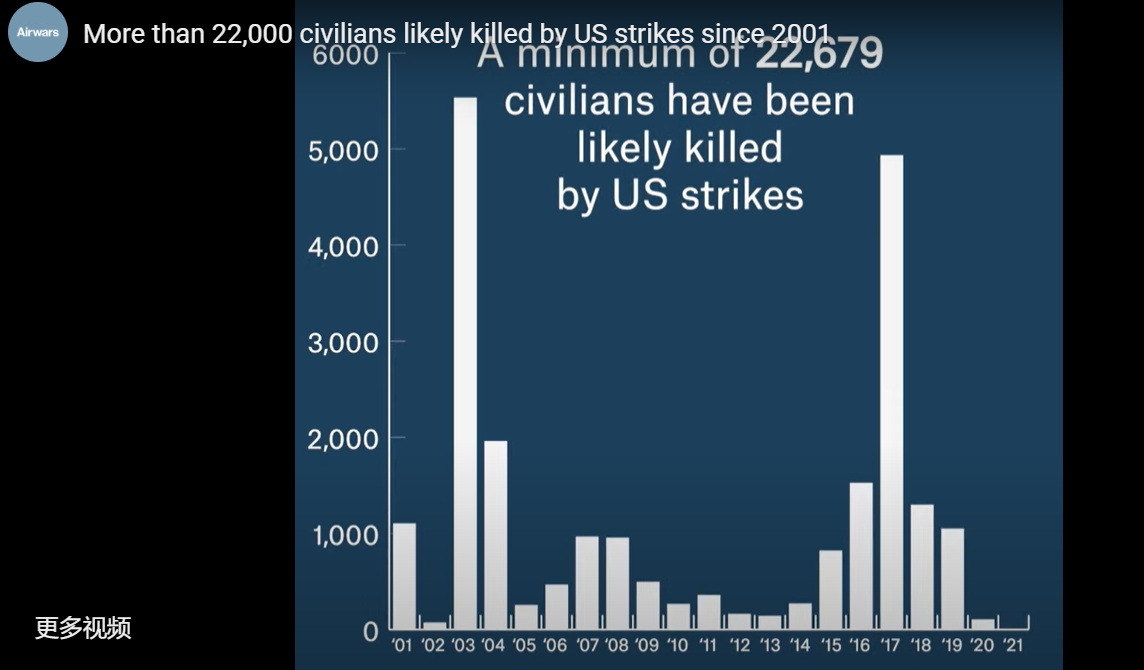 无辜惨死在美军袭击下的冤魂极多。据英国研究机构“空中战争”发布的数据,过去20年中,因美军空袭而丧命的无辜平民至少有2.2万人。