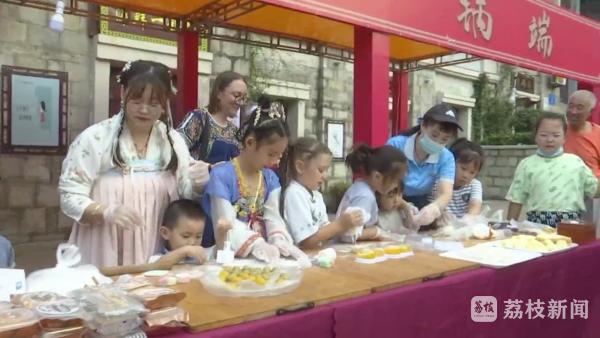 华灯初上,在连云港市连云港老街七一广场,身着汉服的小朋友们提着纸灯笼,兴奋地穿梭于人群当中,在月亮灯、荷花灯与月色的辉映下,浓浓的中秋氛围扑面而来。在冰皮月饼制作现场,来自核电专家村的五名外国友人家属和市民一起体验制作手工月饼,感受中国传统节日文化的魅力。经过老师的简单教学后,外国友人们便迫不及待地“撸起袖子”上阵,有模有样地制作起来。揉、捏、抟、入模、脱模……不一会儿,一个个精美漂亮的月饼便制作完成。