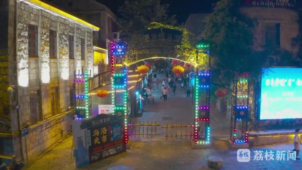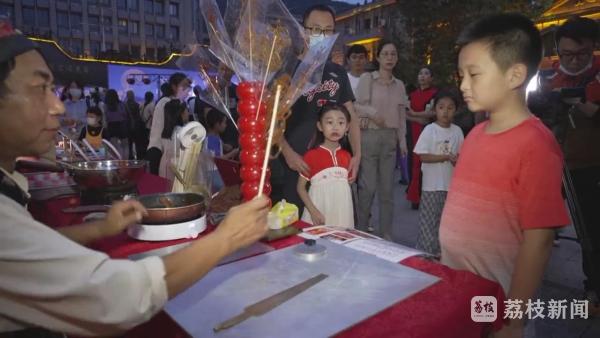 在月下灯谜游园会环节,身穿传统汉服的嫦娥仙子和月兔翩然而至,她们带着游客一起游览连云港老街,看花灯,猜灯谜,玩得不亦乐乎。在中秋传统文化古风文创市集,连云港特色贝雕画、西游元素创意手作、糖画等各类展品琳琅满目、绚丽多姿,游客和市民近距离体验“非遗”和传统文化的趣味,互动感十足。