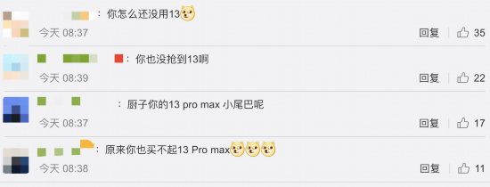 不过,有网友发现,库克的微博小尾巴显示的仍是“iPhone 12 Pro Max”。不少网友纷纷调侃, “合着你也没用上13啊”“你是不是也没抢到13”“原来你也买不起13 Pro max”。