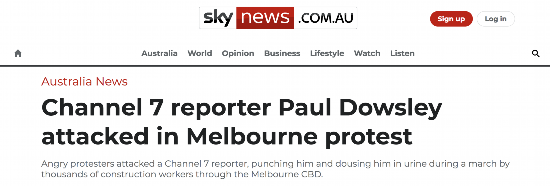 据澳大利亚“天空新闻网”、《每日邮报》报道,当地时间9月21日,墨尔本爆发抗议示威活动,上千名建筑工人走上街头,抗议强制要求工人接种疫苗的政策。报道称,澳媒“第七频道” 记者保罗·道斯利在现场报道时称遭到抗议者各种攻击。