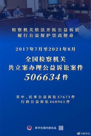 最高人民检察院22日发布统计数据显示,从2017年7月1日公益诉讼检察工作全面推开至今年8月,全国检察机关共立案办理公益诉讼案件506634件,其中,民事公益诉讼37673件,行政公益诉讼468961件。检察机关坚持把诉前实现维护公益目的作为最佳司法状态,共发出诉前检察建议408997件,行政机关回复整改率98.53%。